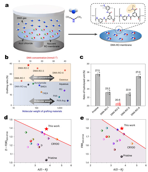 1.aRO膜表面DMA气相接枝过程示意图,(bDMA与文献报道的其他材料在PA分离层上的接枝率对比,(c)对照RO膜和DMA改性RO膜表面的水解单元比例,(de)文献报道及本工作所制备RO膜在渗透选择性与综合耐污性能之间的trade-off效应对比