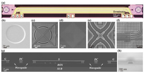 1. (a) 器件光学显微照片 (b)-(h) 各关键元件扫描电镜照片