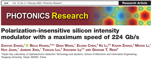 近日,我校电子与信息工程学院张赞允教授团队在硅光调制器方向取得突破性进展,研制出世界上首个单波224Gb/s偏振不敏感硅光调制器,器件在偏振相关损耗、最高工作速率等关键性能上均优于已报道的同类调制器,处于国际领先水平。相关成果以“Polarization insensitive silicon intensity modulator with a maximum speed of 224Gb/s”为题发表在国际光学权威期刊《Photonics Research》。