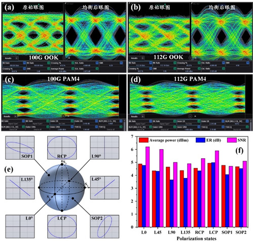 2. (a) 100 Gbaud OOK调制眼图 (b) 112 Gbaud OOK调制眼图 (c) 100 Gbaud PAM4调制眼图 (d) 112 Gbaud PAM4调制眼图 (e) 邦加球上不同光偏振态 (f) 不同入射偏振态下100G OOK眼图性能指标对比