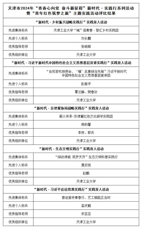 近日,天津市2024年“青春心向党 奋斗新征程”新时代·实践行系列活动暨“青年红色筑梦之旅”主题实践活动评比结果公布,我校5个赛道的5支队伍获评先进集体标兵,5名学生获评先进个人标兵,7名教师获评优秀指导教师,学校被评为5个赛道的优秀组织单位,再获此项活动标兵荣誉大满贯。
