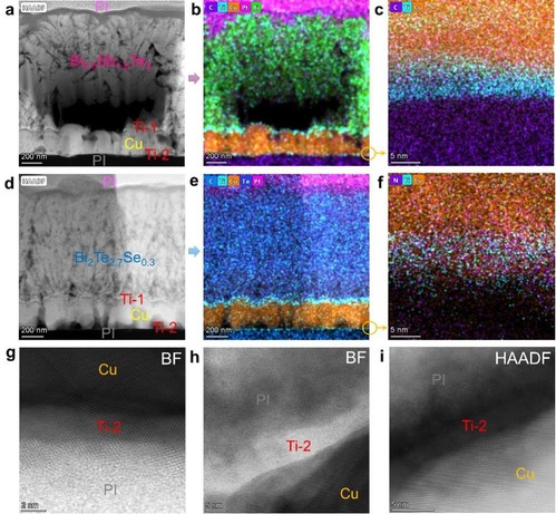 图2(a,b)PI/Ti-2/Cu/Ti-1/BST断面的Cs-STEM-HAADF和相应EDS图;(c)局部PI/Ti-2/Cu放大的EDS图;(d,e) PI/Ti-2/Cu/Ti-1/BTS断面的Cs-STEM-HAADF和相应EDS图;(f)局部PI/Ti-2/Cu放大的EDS图;(g)PI/Ti-2/Cu/Ti-1/BST样品中PI/Ti-2/Cu的高分辨 Cs-STEM-BF图;(h-i) PI/Ti-2/Cu/Ti-1/BTS样品中PI/Ti-2/Cu的高分辨 Cs-STEM BF和HAADF图