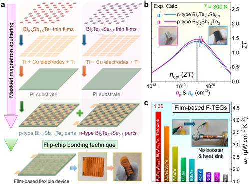 图1(a)柔性器件制备过程;(b)p-Bi₀.₅Sb₁.₅Te₃和n-Bi₂Te₂.₇Se₀.₃热电薄膜性能的理论与实验值比较;(c)文献报道与本工作的标准化发电功率密度对比,其中插图为三个串联连接的器件贴在约50°C不规则热源时的应用,充分展示了其卓越的发电性能。
