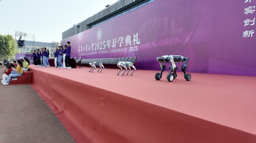 序典环节,艺缘艺术团的同学们与校友企业的机器狗共同上演了一场“人机共舞”,科技与艺术的巧妙融合点燃现场气氛。