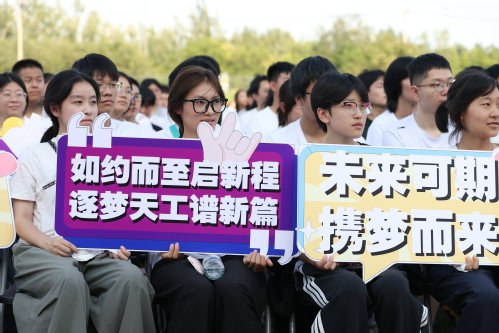 旭日运动场上,“不负韶华,奋力书写为中国式现代化挺膺担当的青春篇章”“生逢其时,重任在肩,天工助你成就美好未来”等迎新标语赫然在目,字句之间凝聚着学校的深切期许与师长的诚挚祝愿,为同学们的新征程注入了温暖而坚定的精神力量。